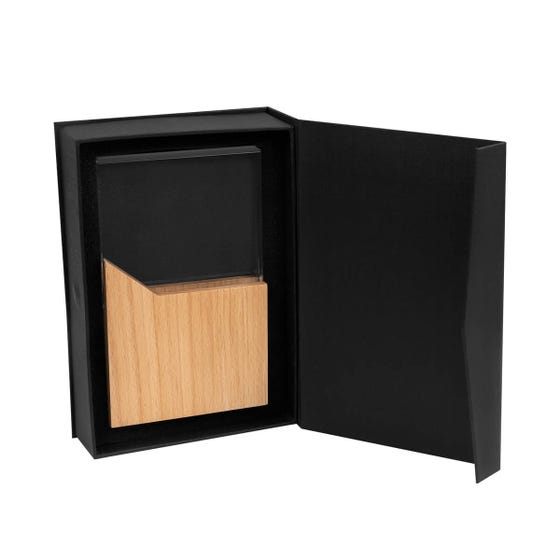 Elegante y clásico reconocimiento que combina vidrio y madera de pino. Material: Vidrio / Madera. Medida: 12 x 19.5 x 3.5 cm Reconocimiento / 15 x 22.5 x 4.7 cm Caja. Color de tinta: Beige. Técnica: Grabado Arena / Láser. Área: 9 x 6.5 cm.