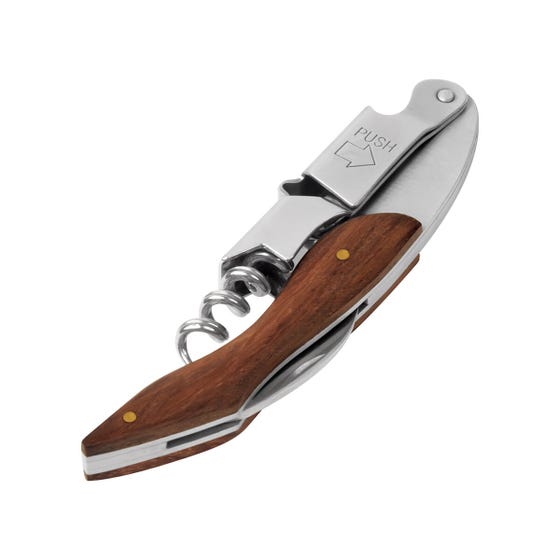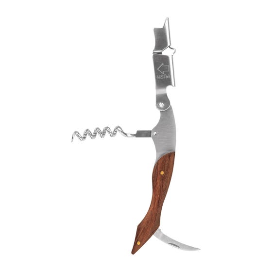 Sacacorchos de acero inoxidable. Material: Acero Inoxidable / Madera. Medida: 3 x 12.2 x 1.6 cm Sacacorchos / 5.3 x 14 cm Funda. Técnica: Láser / Tampografía. Área: 2.5 x 0.6 cm Sacacorchos / 2 x 5 cm Funda.