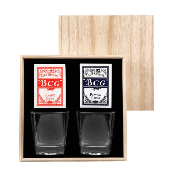 Set de bar con 2 vasos whiskeros de cristal y 2 barajas para juego. Material: Vidrio / Madera / Plástico. Medida: 21.3 x 21.3 x 10 cm Estuche / 8 x 8.5 cm Vasos. Capacidad: 240 ml. Técnica: Serigrafía / Grabado Arena / Láser. Área: 17 x 17 cm Estuche / 4 x 4 cm Vasos.