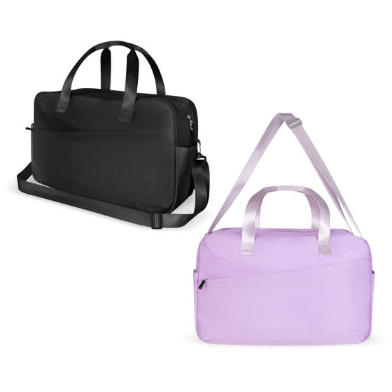 Maleta con compartimento expandible para ampliar su capacidad según tus necesidades. Material: Poliéster. Medida: 45 x 30 x 28.5 cm. Técnica: Serigrafía / Bordado. Área: 20 x 12 cm. Colores: Morado y negro.