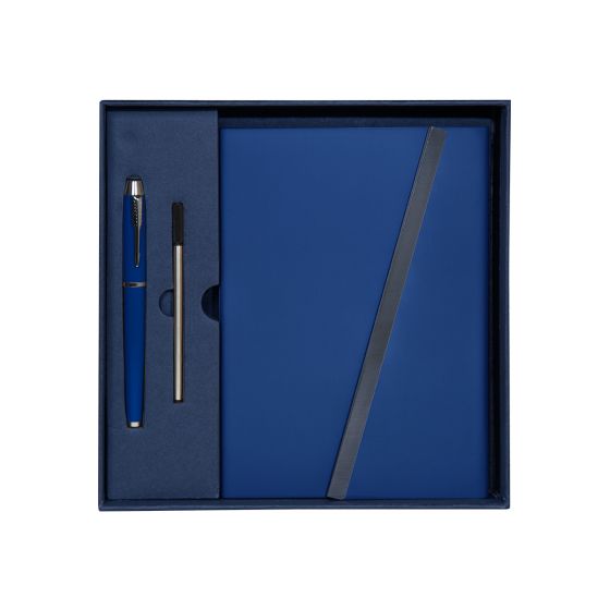 Set de regalo que incluye una libreta de 80 hojas con pasta rígida y solapa magnética, un bolígrafo metálico y un repuesto de tinta adicional. Material: Curpiel y Metal Libreta / Acero Inoxidable Bolígrafo. Medida: 15 x 21 cm Libreta / 0.9 x 14 cm Bolígrafo. Color de tinta: Negra. Técnica: Láser. Área: 6.5 x 5 cm Portada superior / 4.5 x 3 cm Solapa / 3 x 0.7 cm Bolígrafo. Colores: Azul, gris y negro.