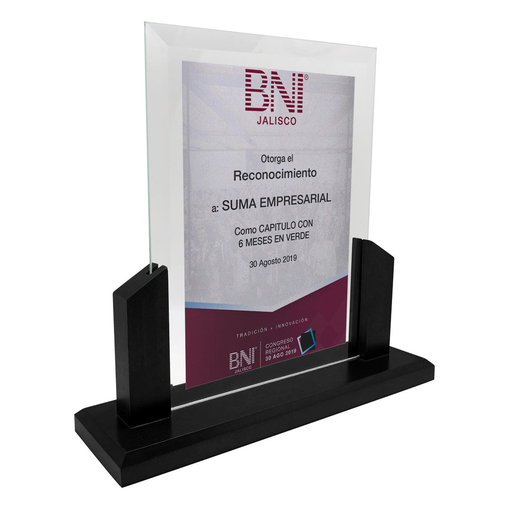 Reconocimiento Grande de Cristal Biselado y Placa de Metal con base de Madera. Medida: 29 x 27.6 cm. Medida del cristal: 20.5 x 25.6 cm. Área de impresión: 14.5 x 20 cm. Color de base: Negra.