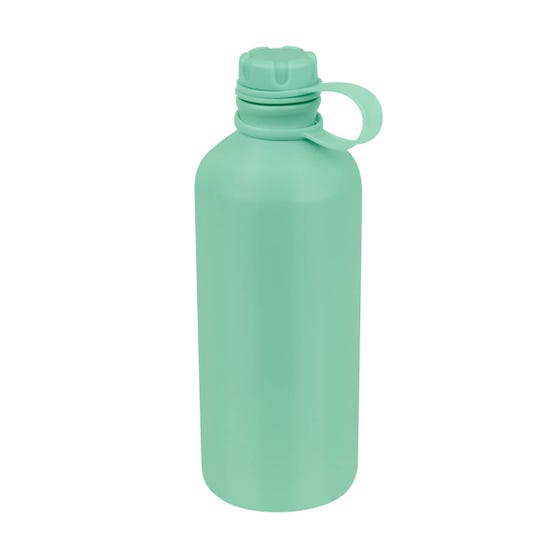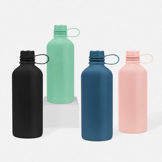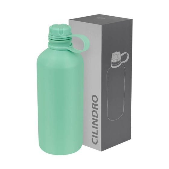 Cilindro metálico de una pared con tapa de plástico y cierre de rosca que asegura un sellado total. Material: Aluminio / Plástico. Medida: 7.3 x 19.7 cm. Capacidad: 600 ml. Técnica: Láser / Serigrafía. Área: 5 x 8 cm. Colores: Azul marino, negro, rosa y azul aqua.