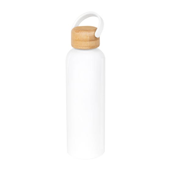 Cilindro metálico para sublimar de una pared. Tapa de bambú con cierre de rosca y asa de plástico. Material: Aluminio / Plástico / Bambú. Medida: 7 x 23.5 cm. Capacidad: 700 ml. Técnica: Láser / Serigrafía. Área: 19 x 17 cm Extendido.