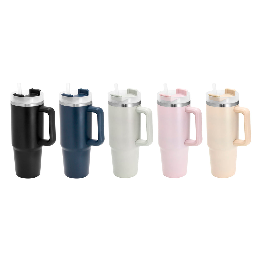 Mug doble pared, sellado al vacío con sorbete. Tecnología Vcuum. Interior en acero 304 y exterior en acero 201. Material: Acero inoxidable. Medida: 8.8 x 24 cm. Capacidad: 880 ml. Mantiene hasta 12 hrs la temperatura de las bebidas calientes y 24 hrs de las bebidas frías. Colores: beige, rosa, gris, azul y negro. Método de impresión: Tampografía, serigrafía, grabado en láser y DTF UV (Transfer Digital UV).