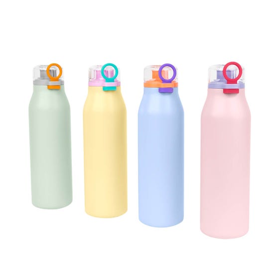 Termo doble pared. Cerrado al vacío. Pared interna y externa de acero inoxidable. Material: Acero inoxidable / Plástico / Silicón. Medida: 7.4 x 25 cm. Capacidad: 600 ml. Técnica: Láser / Serigrafía. Área: 5 x 10 cm. Colores: Azul, amarillo, rosa y verde.