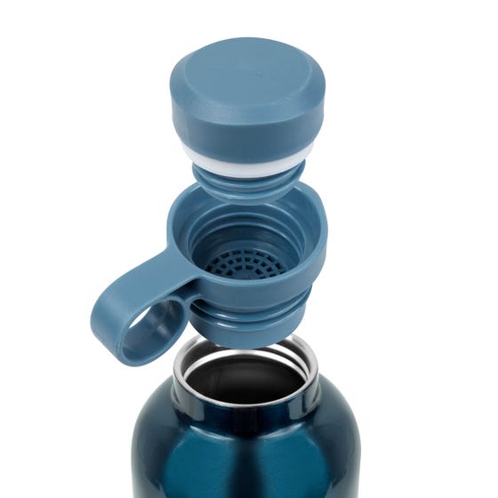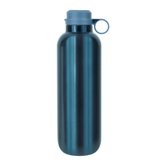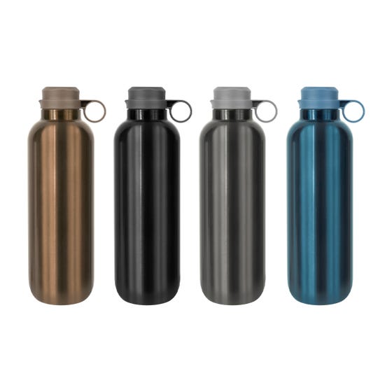Termo doble pared, cerrado al vacío. Pared interna y externa de acero inoxidable. Material: Acero Inoxidable / Plástico. Medida: 8.9 x 24 x 7.5 cm. Capacidad: 650 ml. Técnica: Láser / Serigrafía / Tampografía. Área: 5 x 9 cm. Colores: Azul, negro, cafe y gris.
